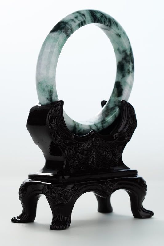 #0170 Dark Green White Black Flower Jadeite Jade Bangle Size 62.3