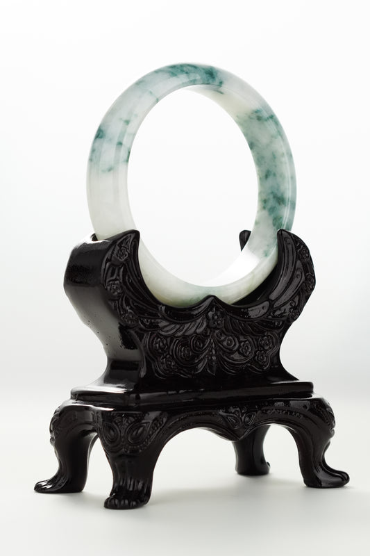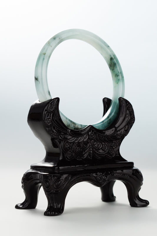 #0064 “Ink Painting" Icy Ink Bluish Green Flower Jadeite Jade Bangle Size 60
