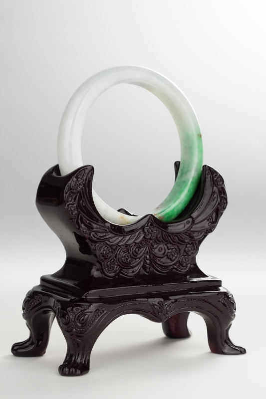 #0255 Sun Green White Red Spot Jade Bangle Size 52.5