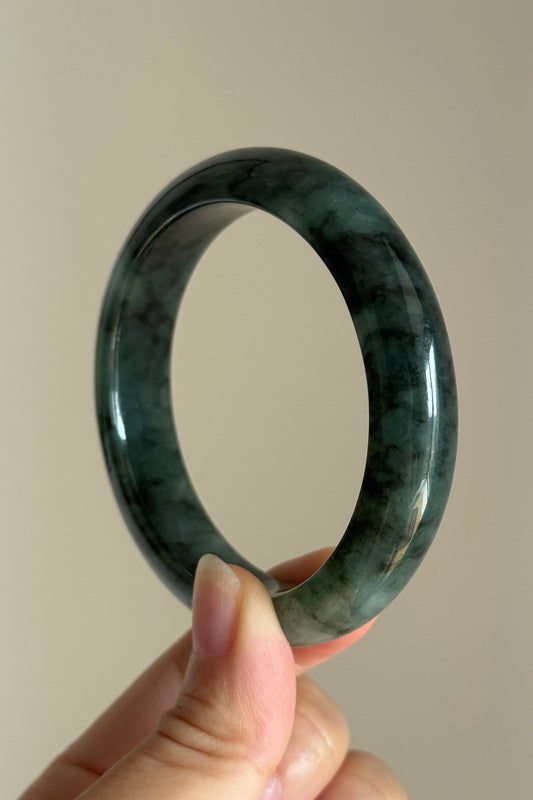 #0409 Icy Dark Olive Green Ink Flower Jade Bangle Size 56.3