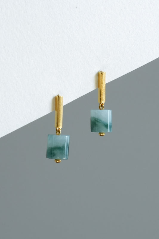 #E0303 Icy Bluish Green Flower Jadeite Jade Cylinder 18K Yellow Gold Earrings