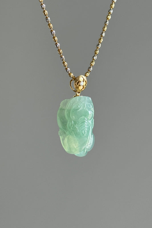 #P0493 "Pixiu" Icy Blue Green Flower Jadeite Jade 18K Yellow Gold Pendant