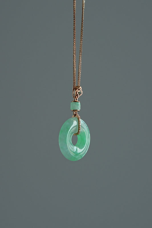 #0432 "Bi" Highly Icy Bright Sun Green Jadeite Jade Donut 18K Rose Gold VS Diamonds Pendant