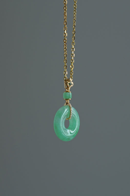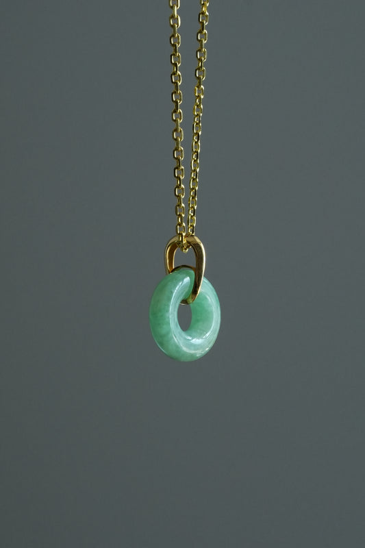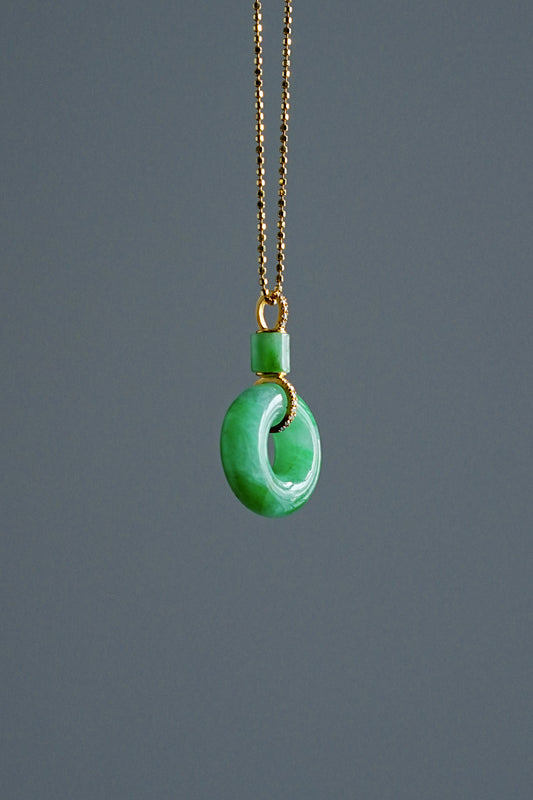 #0429 "Ping An Kou" Vivid Green Jadeite Jade Mini Donut 18K Yellow Gold Pendant