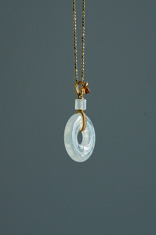 #0434 "Bi" Icy Bright Sun Green Jadeite Jade Donut 18K Yellow Gold VS Diamonds Pendant