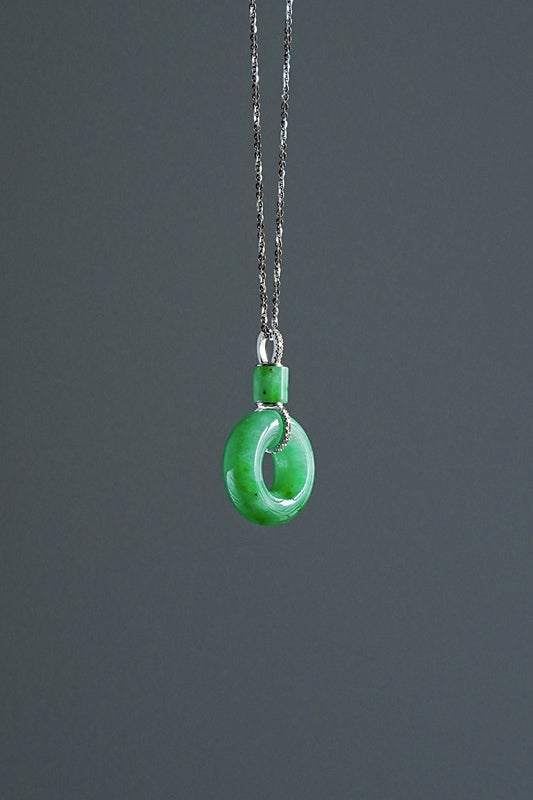 #0440 "Ping An Kou" Vivid Green Jadeite Jade Donut 18K White Gold Pendant