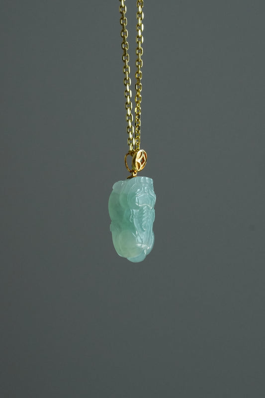 #0437 "Pixiu" Icy Apple Green Jadeite Jade 18K Yellow Gold Pendant
