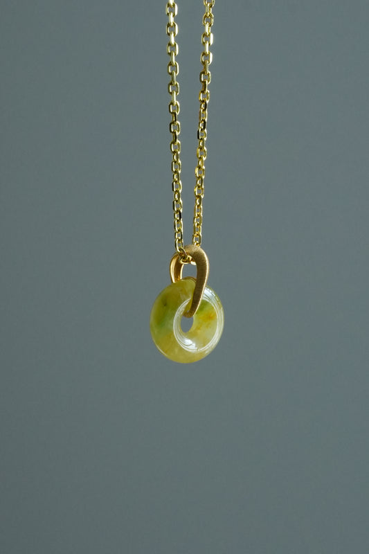 #0428 "Ping An Kou" Icy Vivid Yellow Green Jadeite Jade Mini Donut 18K Yellow Gold Pendant