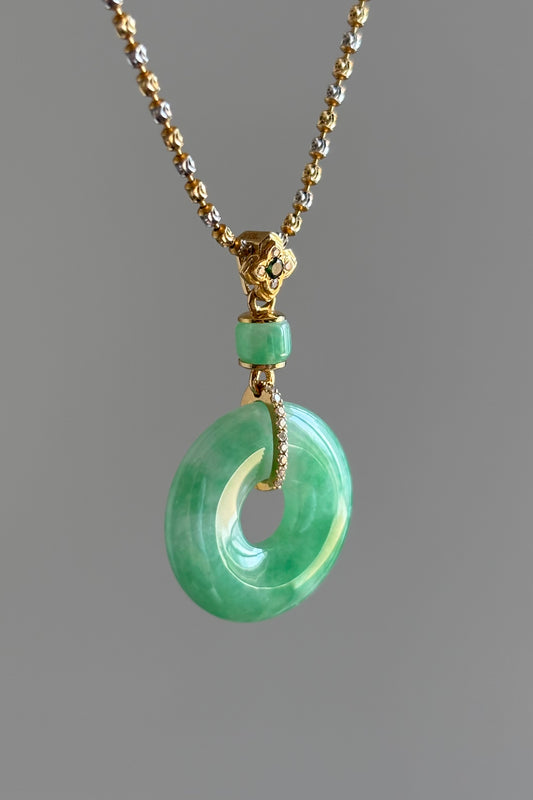 #P0434 "Bi" Icy Bright Sun Green Jadeite Jade Donut 18K Yellow Gold VS Diamonds Pendant