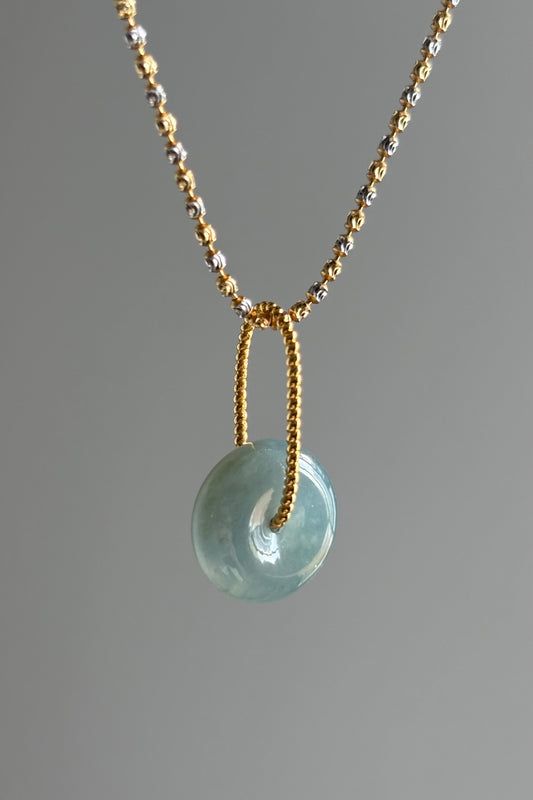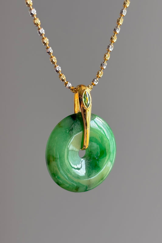 #P0454 "Bi" Icy Sun Green Jadeite Jade Donut 18K Yellow Gold Pendant