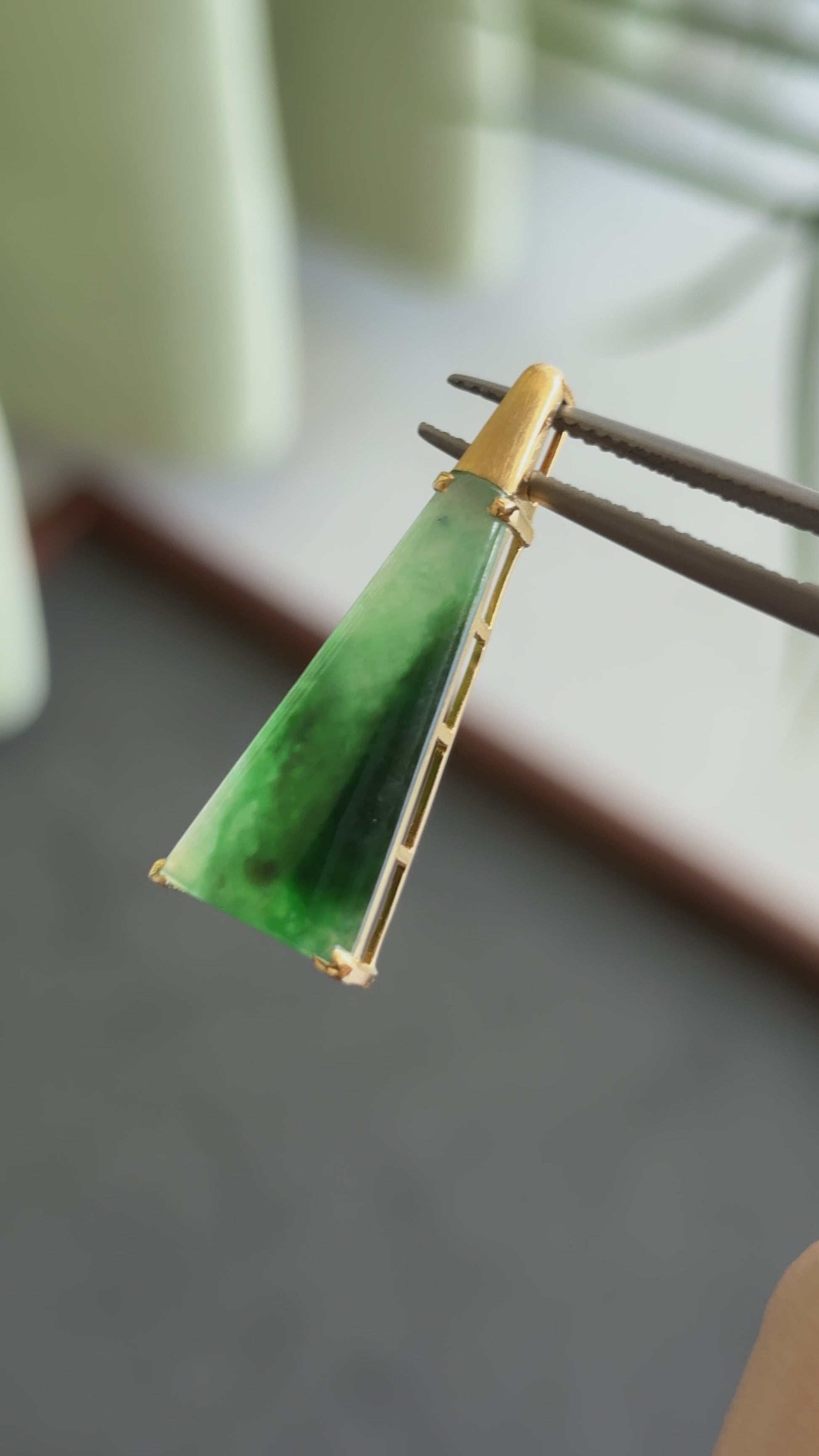#0445 "Wu Shi" Highly Icy Rich Green Jadeite Jade Peace 18K Yellow Gold Pendant