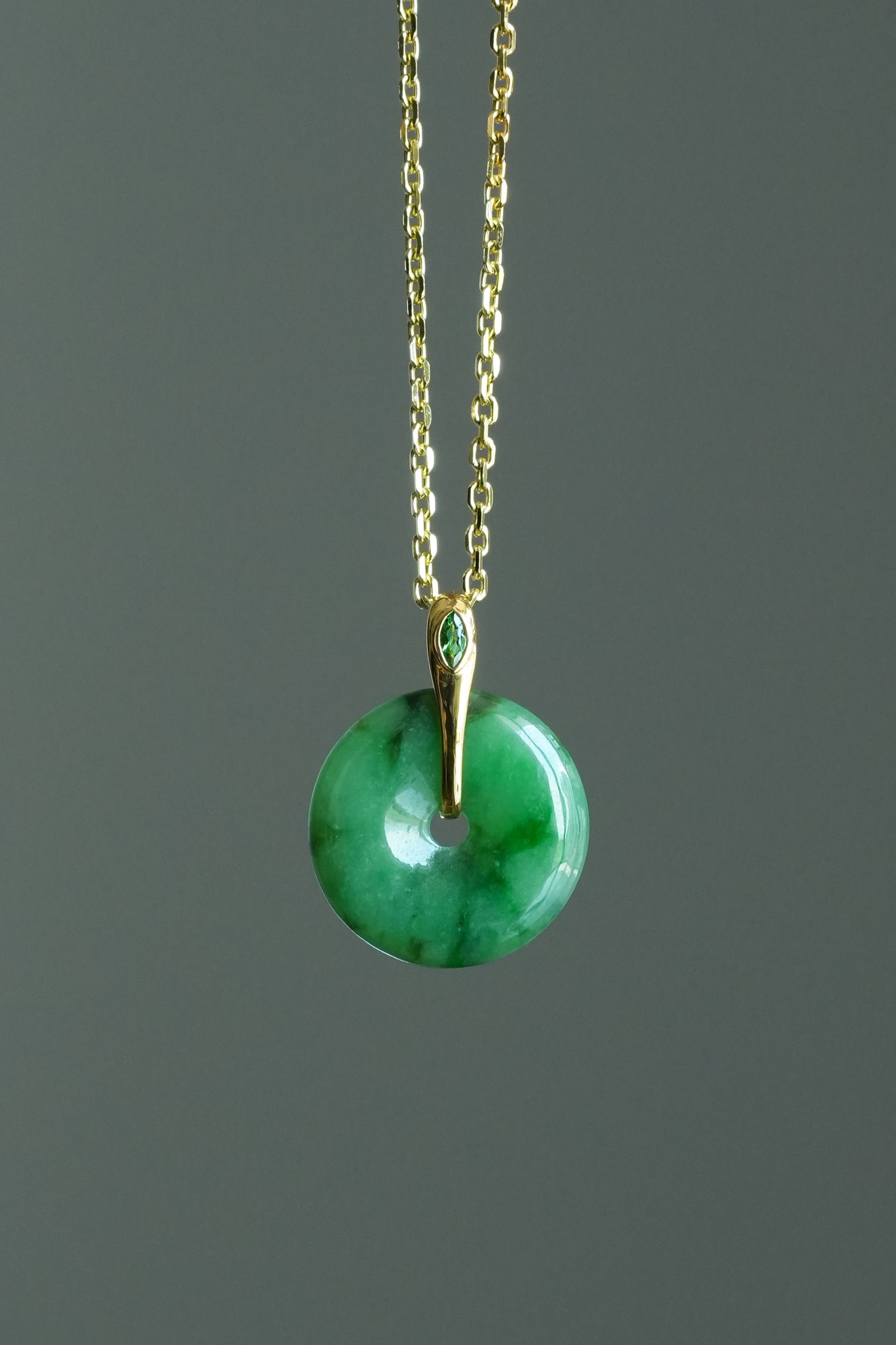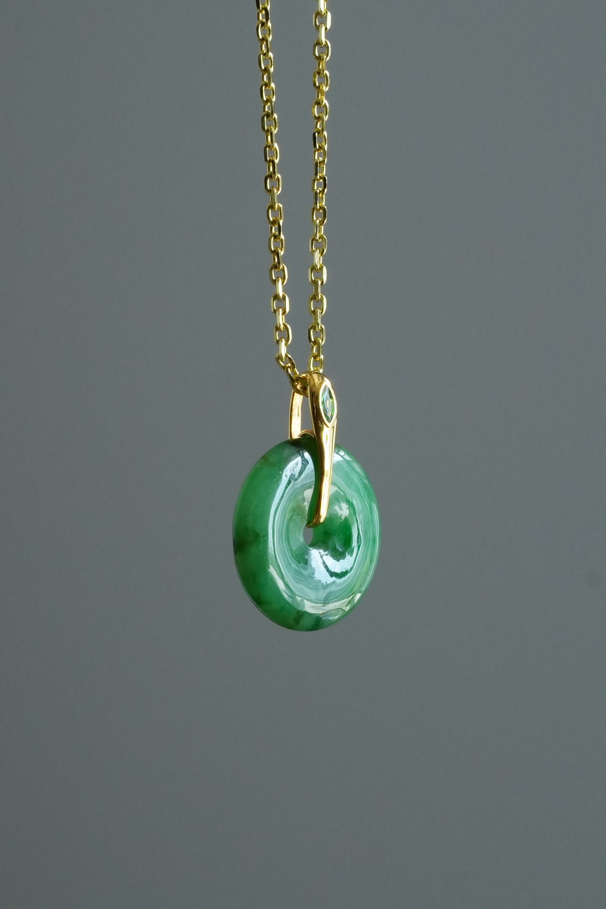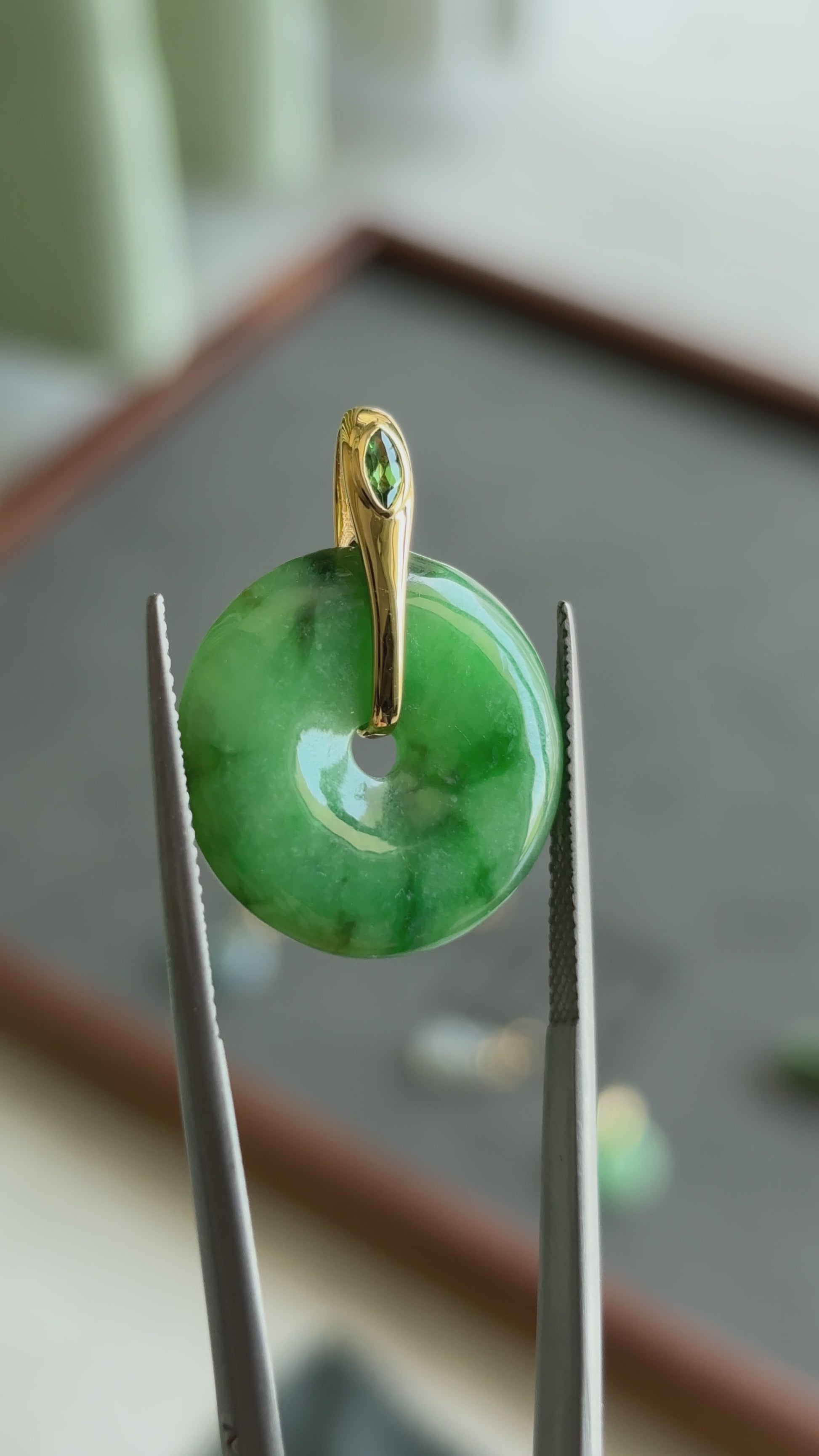 #0447 "Ping An Kou" Silky Rich Green Jadeite Jade Donut 18K Yellow Gold Pendant