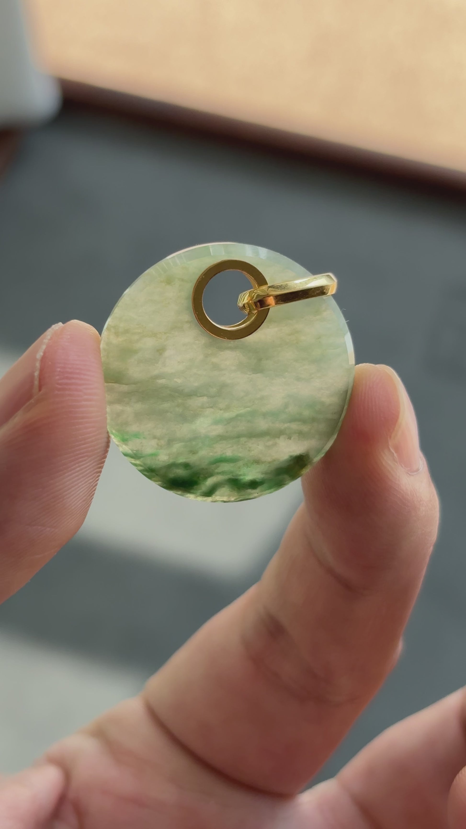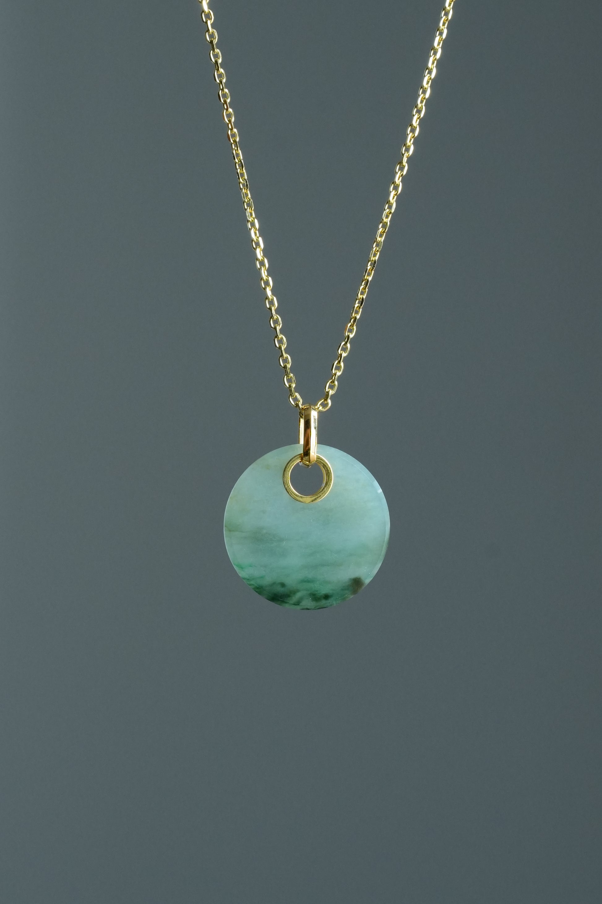 The pendant preserves the jadeite’s natural green patterns, resembling misty landscapes, while its simple round form and gold detailing bring refined elegance and harmony.