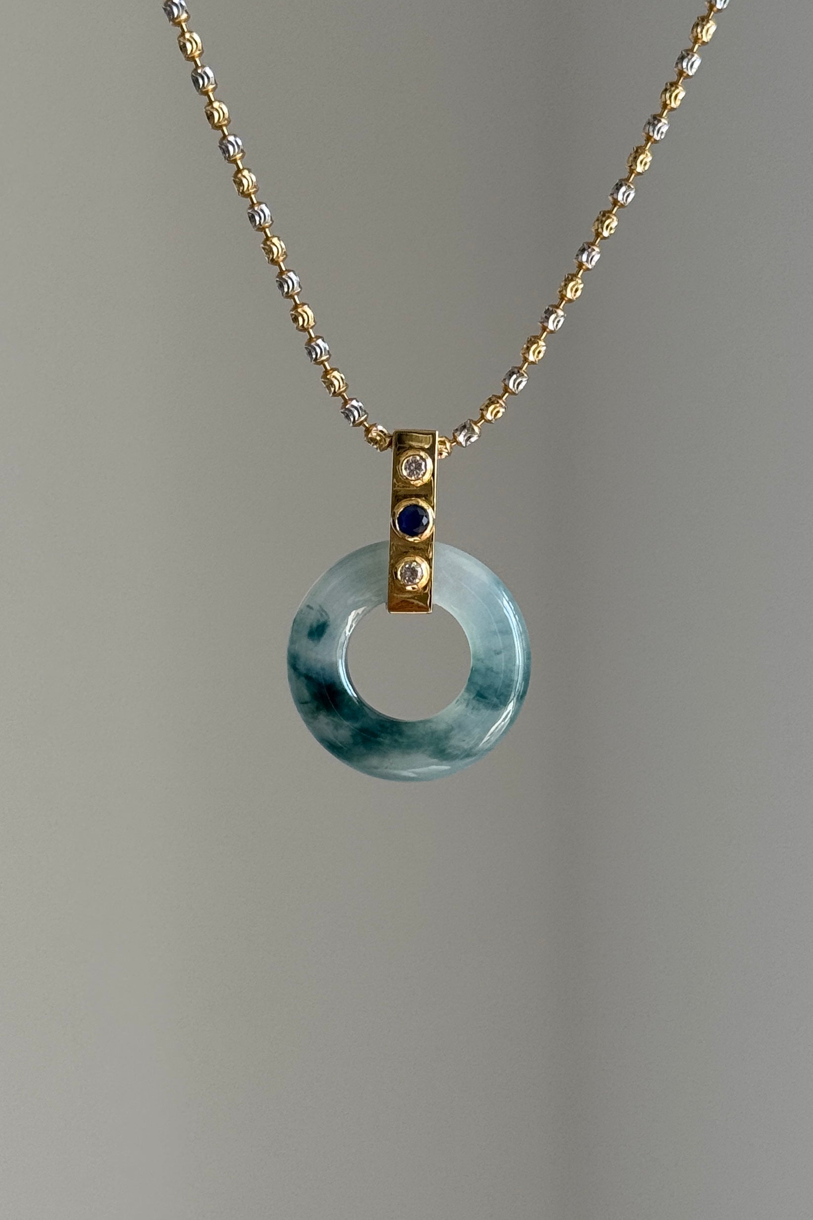 #P0451 "Bi" Icy Blue Jadeite Jade Donut 18K Yellow Gold Sapphire VS Diamonds Pendant
