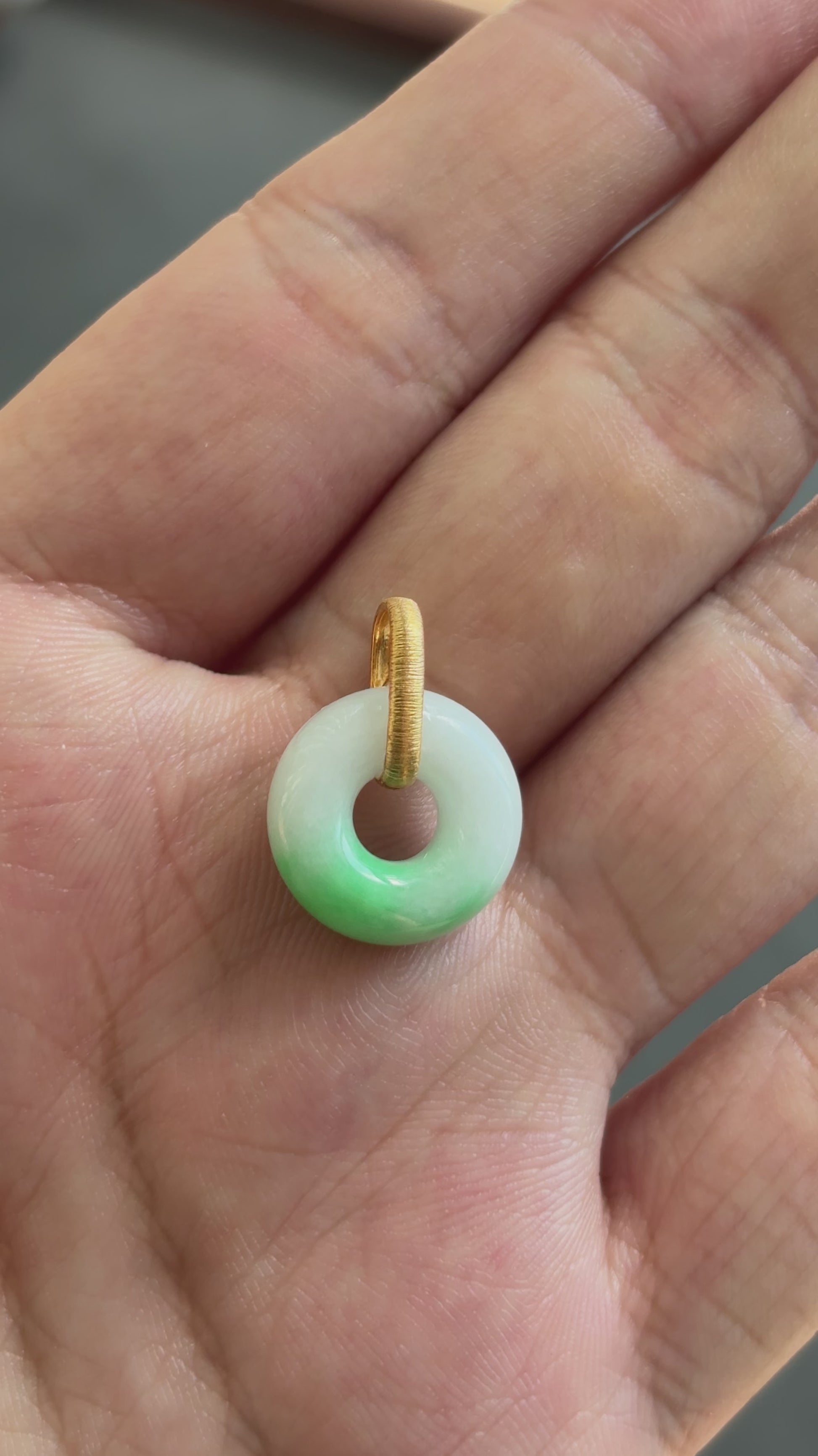#0455 "Bi" Vivid Green Jadeite Jade Donut 18K Yellow Gold Pendant