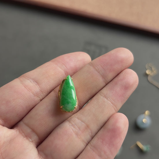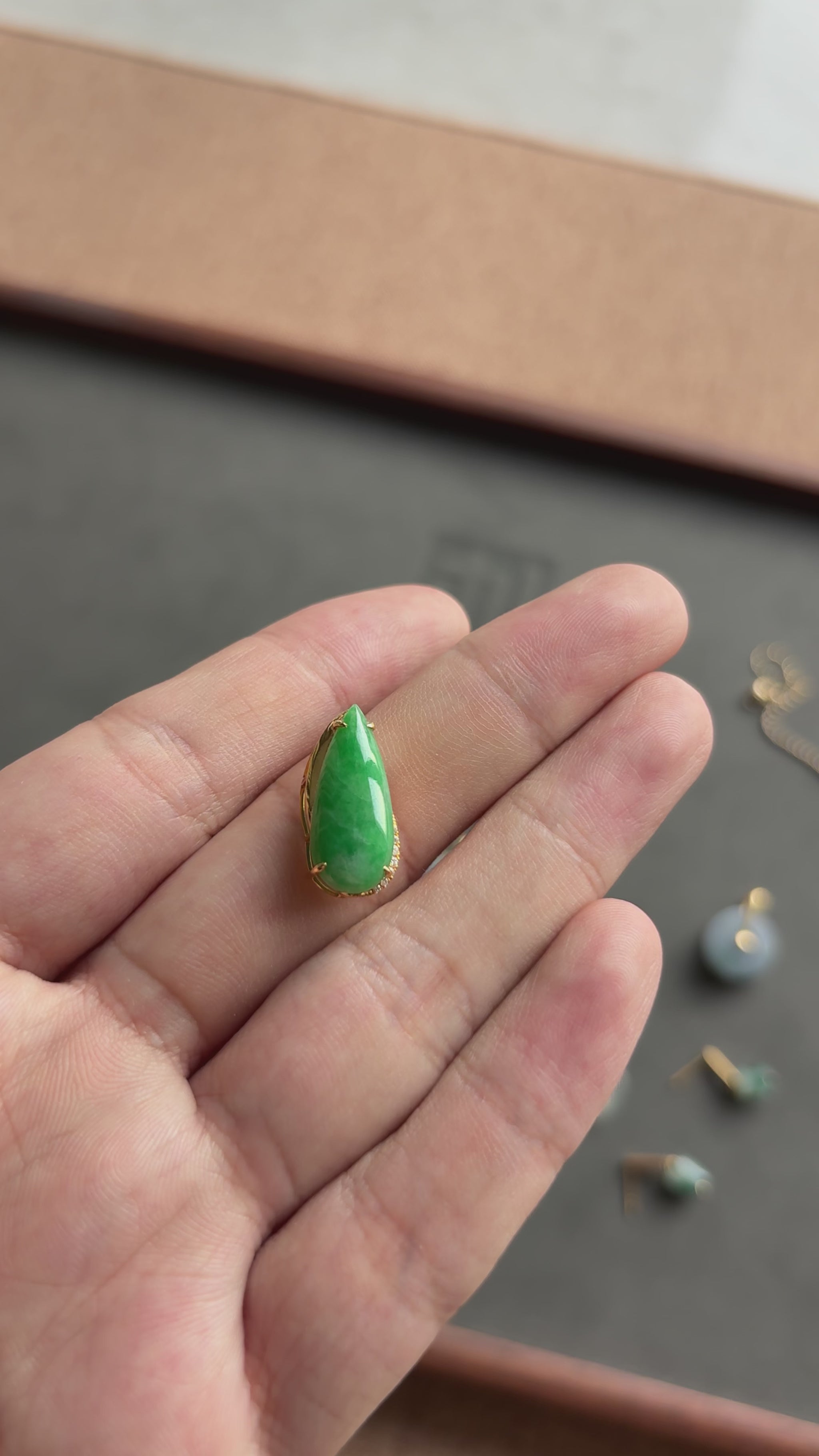 #0465 "Water Drop" Vivid Sun Green Jadeite Jade 18K Yellow Gold Pendant