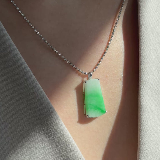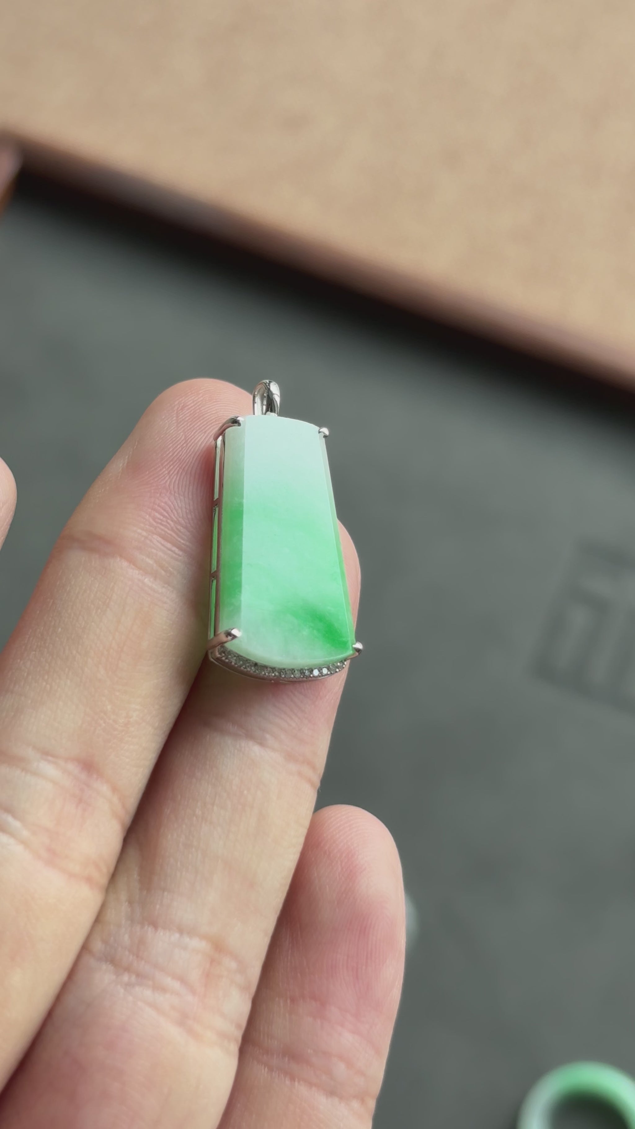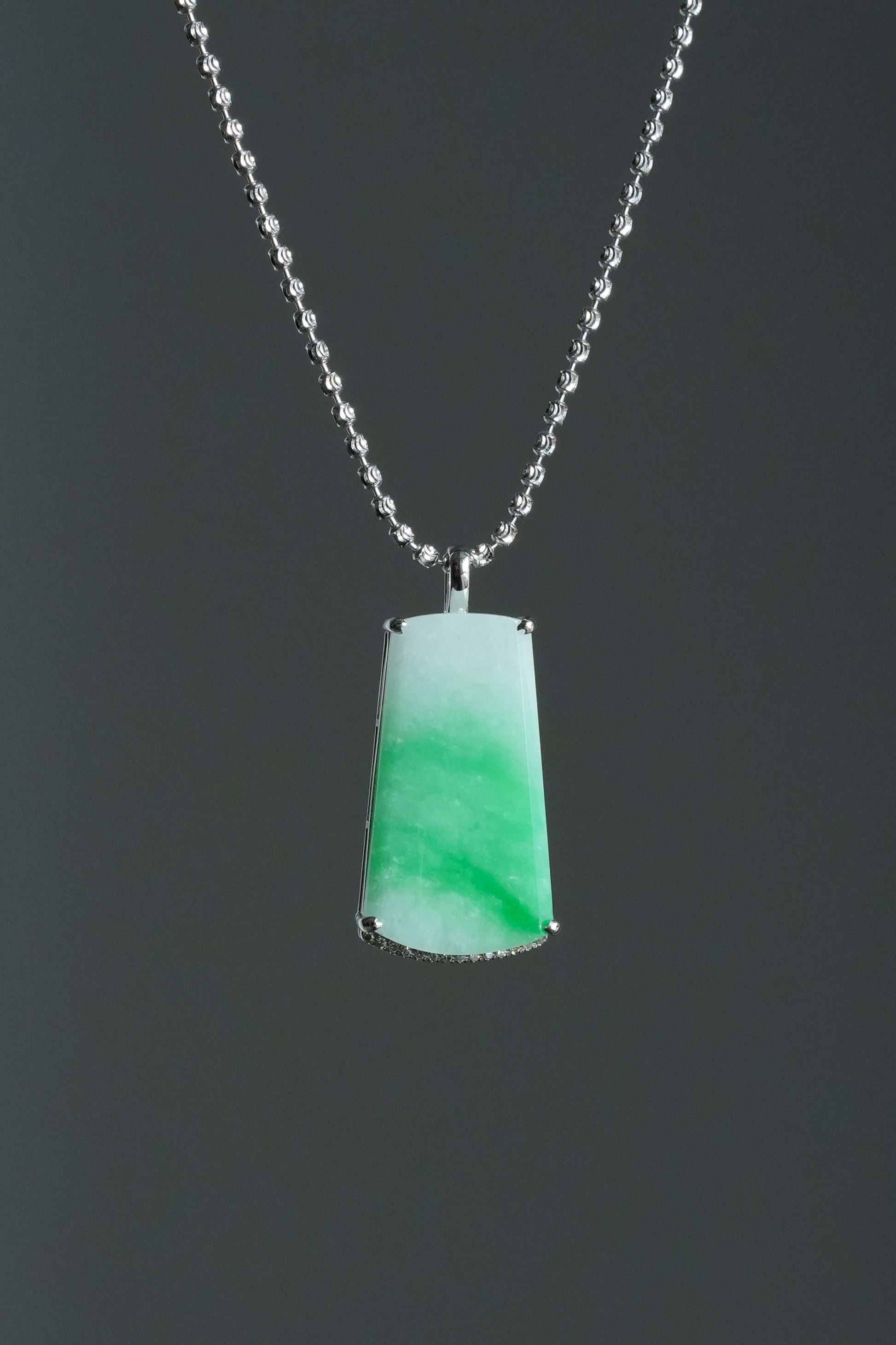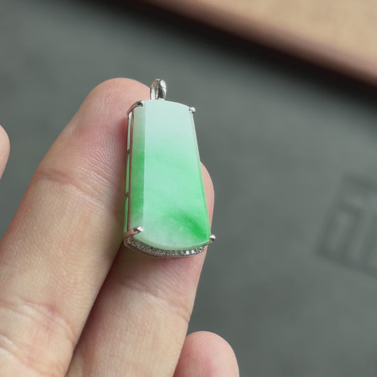 #0472 "WuShi/Peace" Sun Green Jadeite Jade 18K White Gold Pendant
