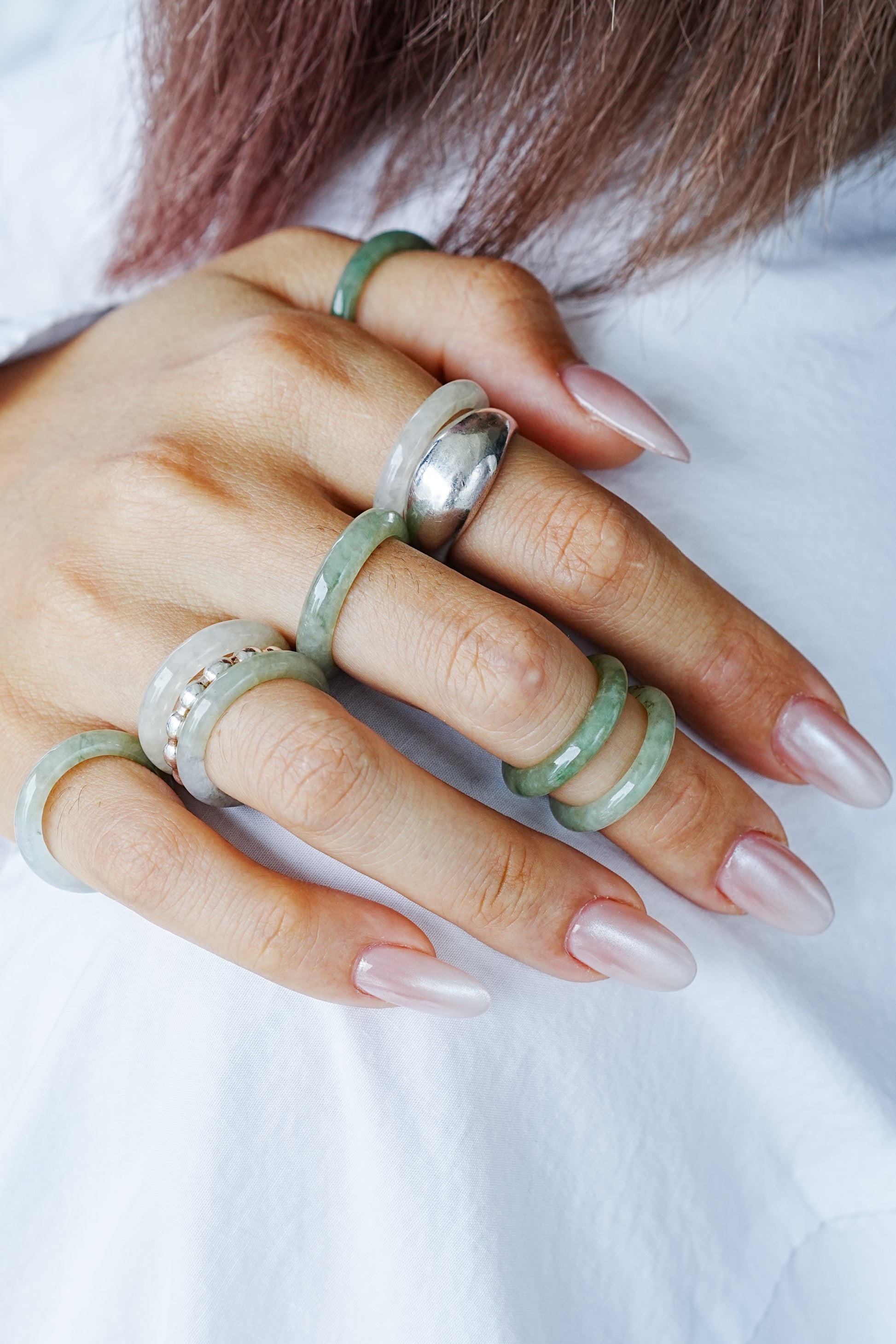 The jadeite ring features a highly icy texture and is available in white, green, or yellow hues.