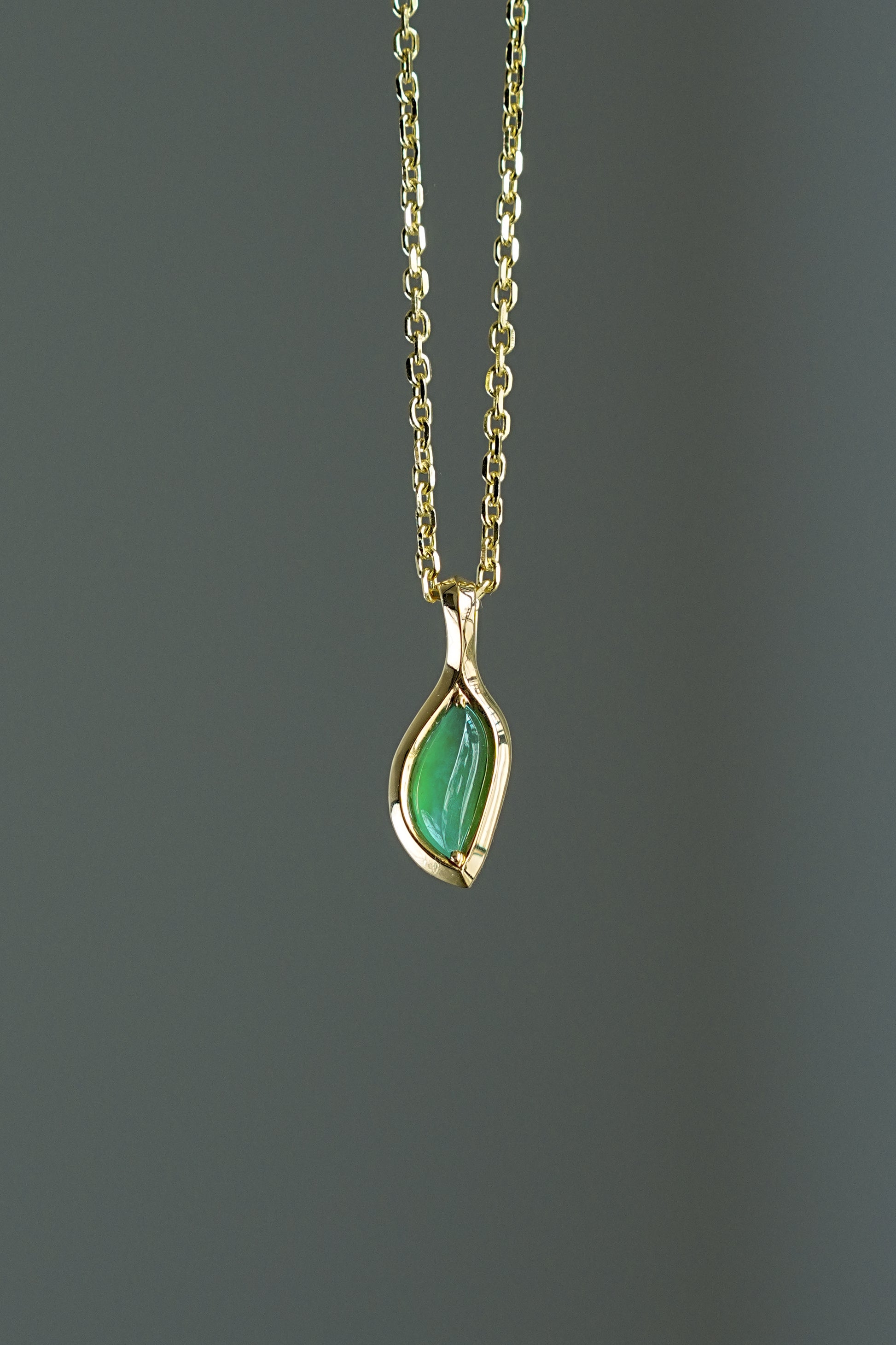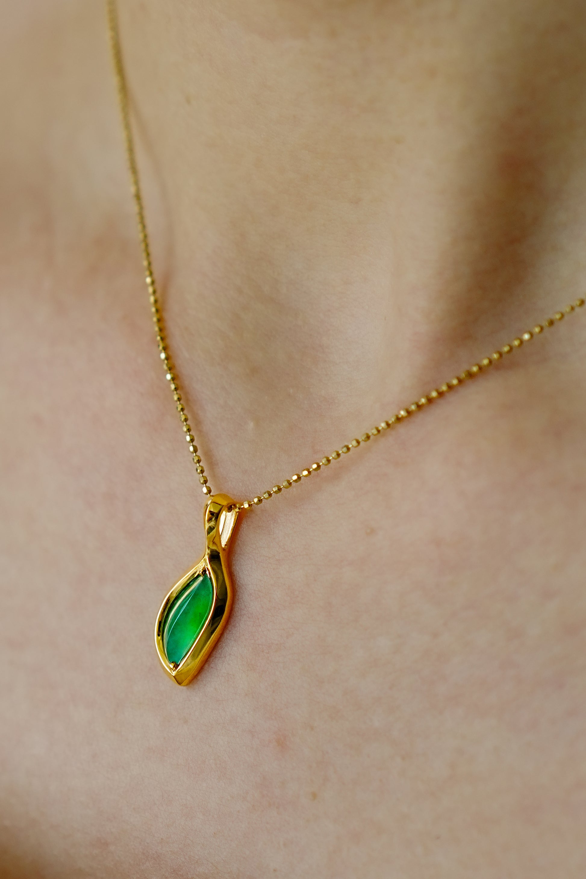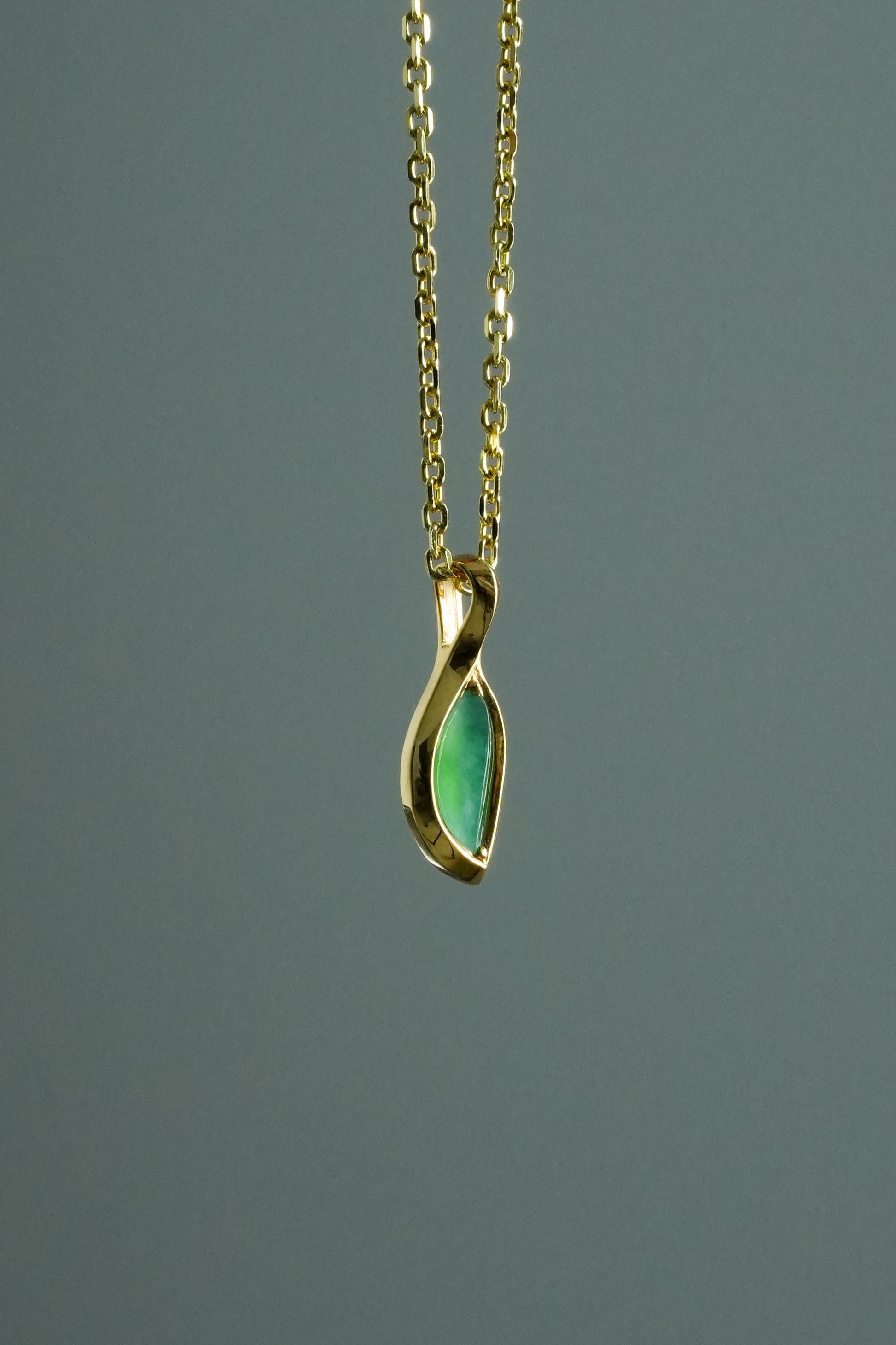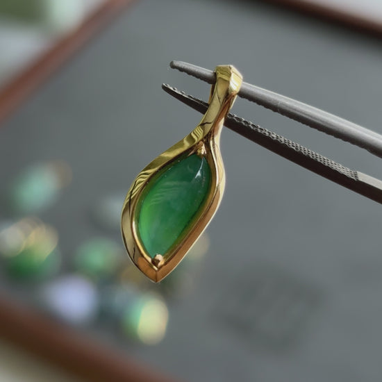 #0426 "Leaf" Highly Icy Bright Sun Green Jadeite Jade 18K Yellow Gold Pendant