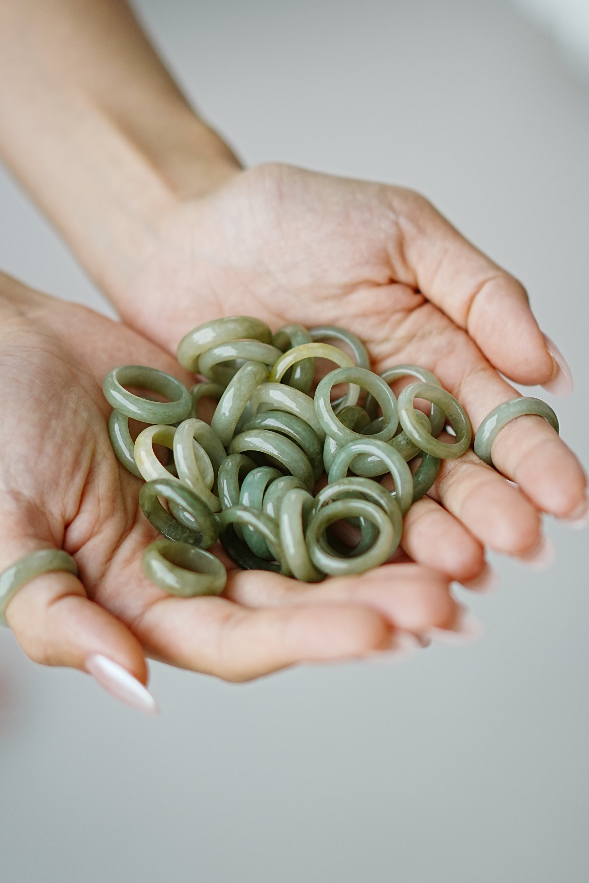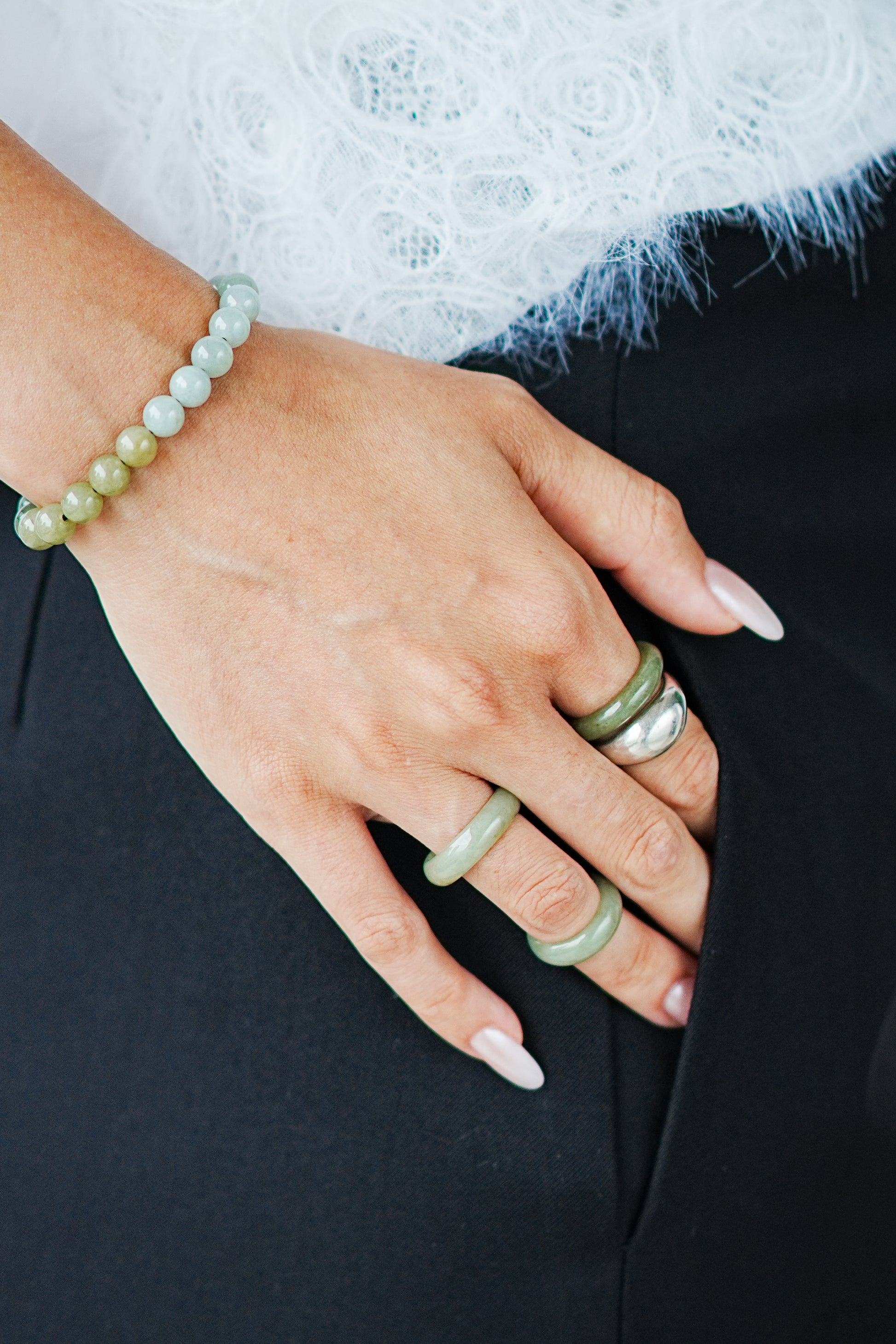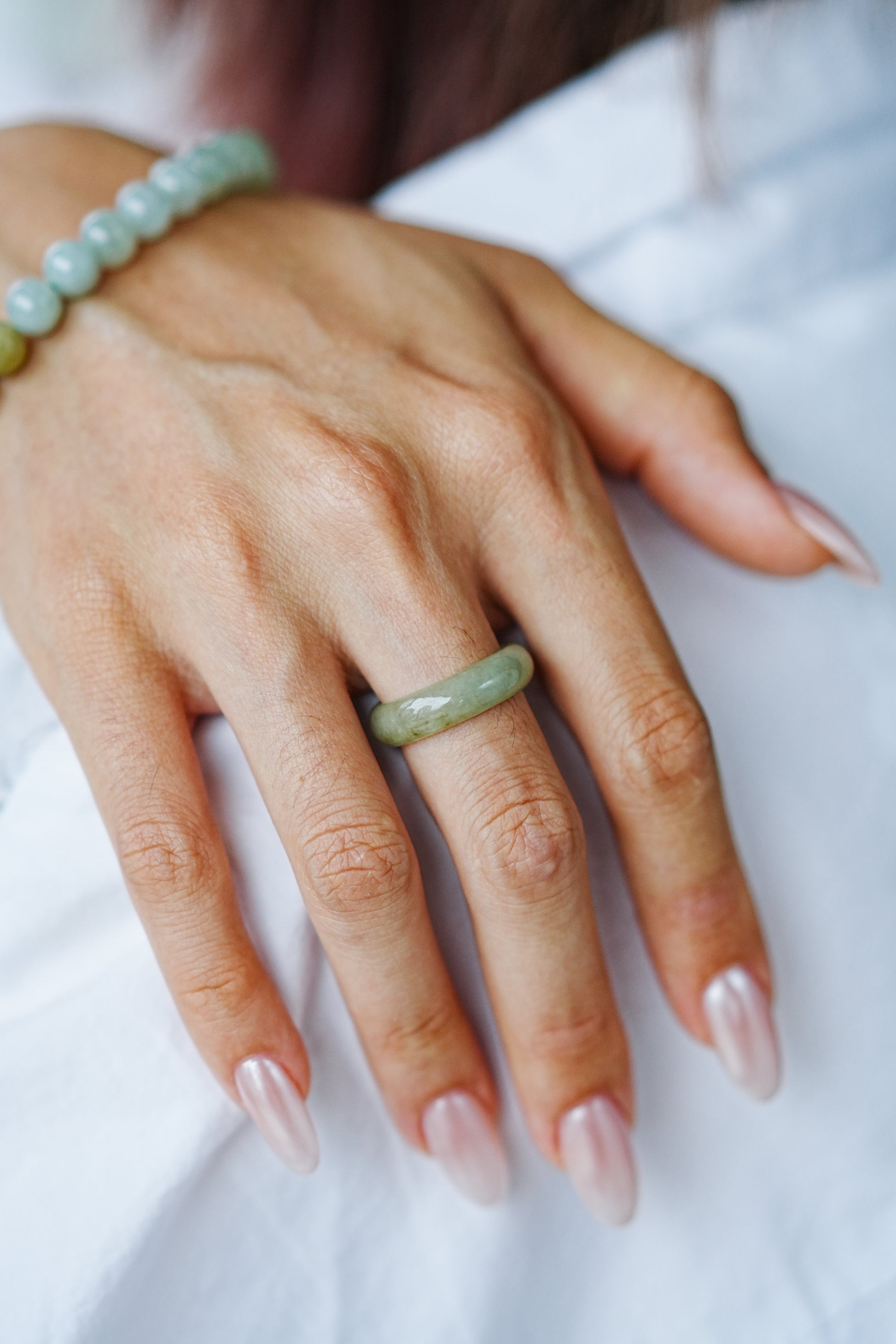 The color is a combination of yellow, green, and white, with a silky texture. The cutting shape references the shape of traditional jade bangles, just like a mini jade bangle worn on your finger, adding a unique oriental traditional design element to your look.