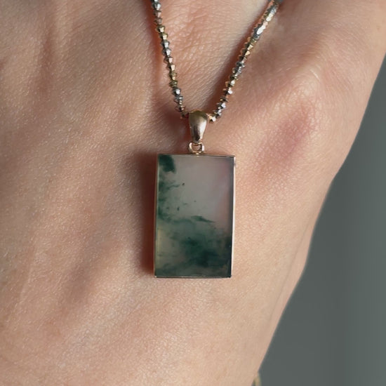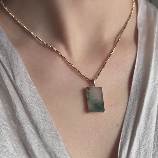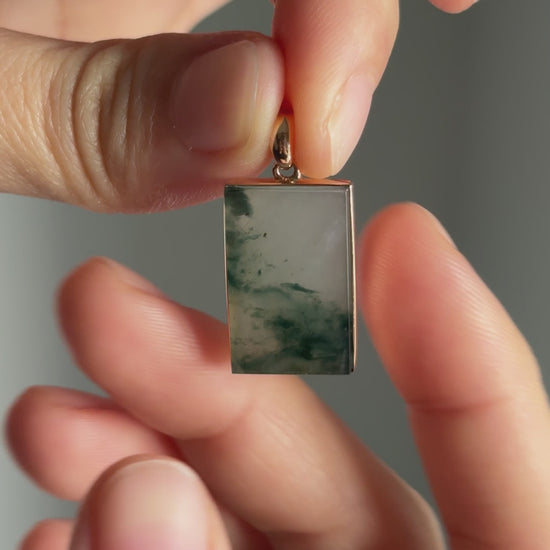 Carved from natural jade, this Wu Shi pendant features a smooth, unadorned surface that highlights the stone’s organic landscape-like patterns.