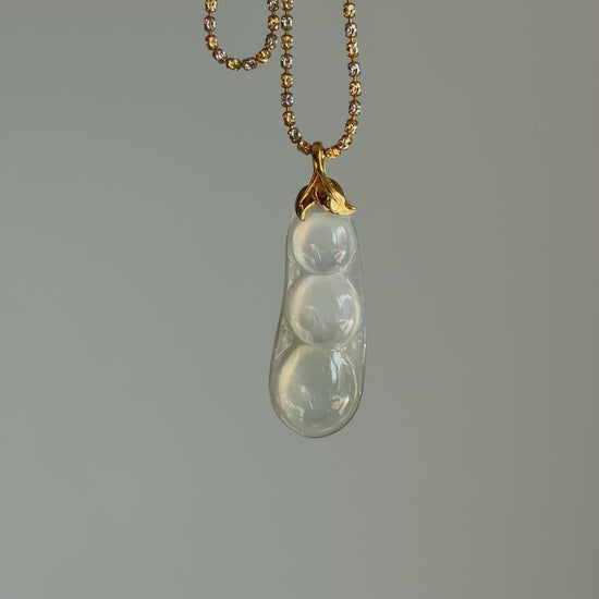 #P0489 "Fortune Bean" Highly Icy White with Light Green Tone Jadeite Jade 18K Yellow Gold Pendant